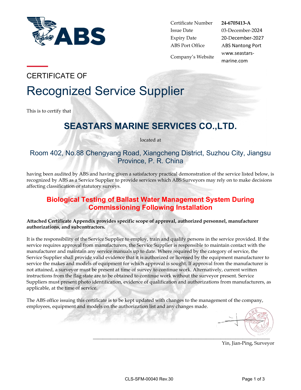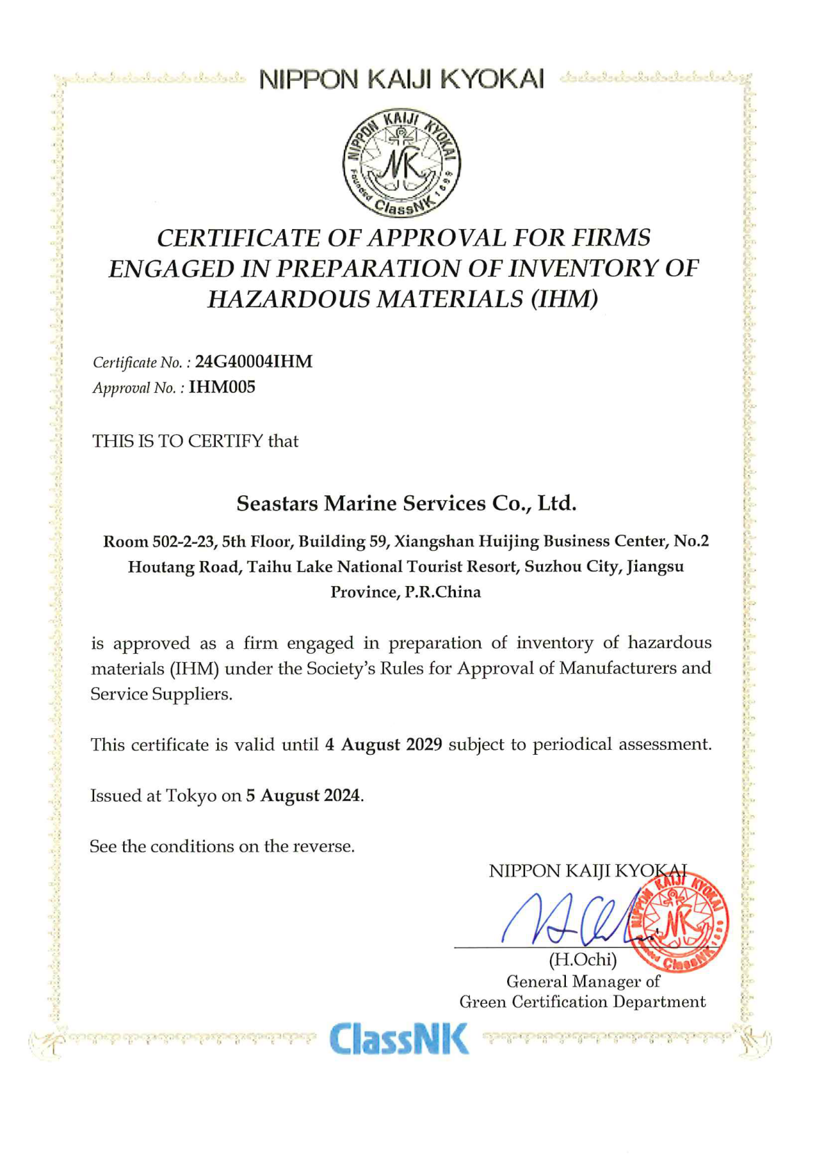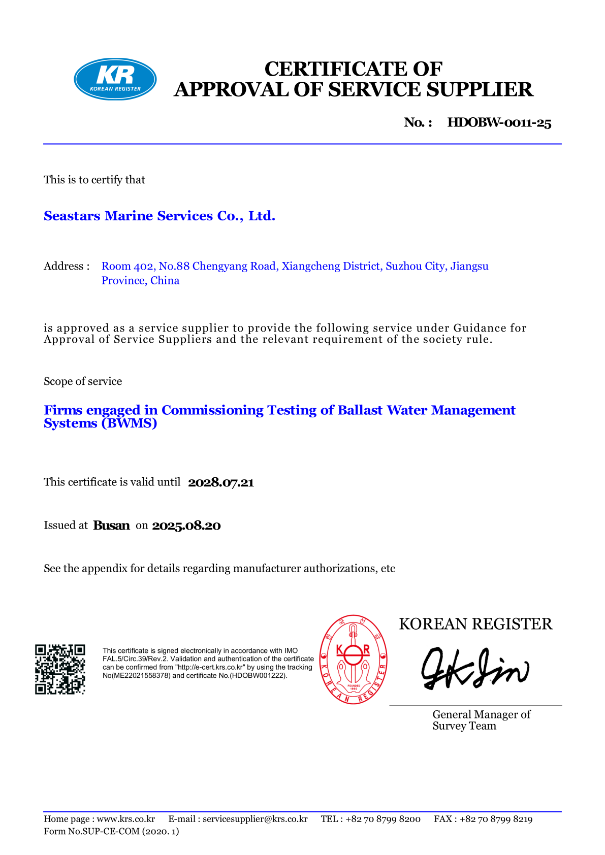 ISO 9001 Accredited service provider, Approved by leading classification societies including NK, DNV, ABS, KR, BV and the Marshall Islands and Liberia Maritime Administrations.